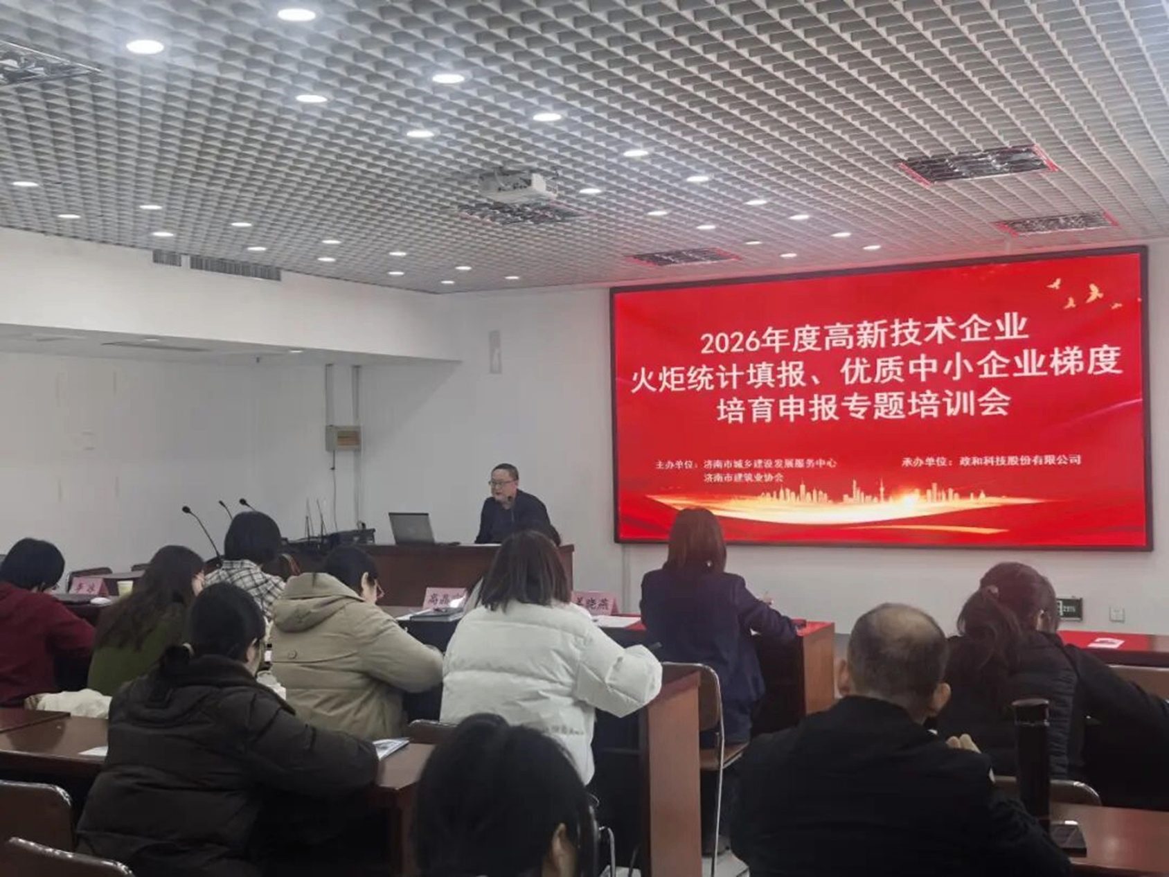 3月10日上午,济南市城乡建设发展服务中心、济南市建筑业协会主办,政和科技股份有限公司承办的“2026年度高新技术企业火炬统计填报暨优质中小企业梯度培育申报专题培训会”在建设大厦成功举行。六十位建筑领域科技企业代表参会,共探发展之道。